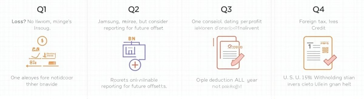❓ 자주 묻는 질문 (FAQ) Q1. 해외주식 손실이 나도 신고해야 하나요? A1. 순손실(최종 결과가 마이너스)이면 신고 의무가 없습니다. 다만, 향후 3년(2025년부터는 5년) 동안 이익과 상계하기 위해 '손실 발생 사실'을 신고해 두는 것이 유리할 수 있습니다. 전문가와 상담하세요. Q2. 여러 증권사에서 거래했는데 어떻게 하나요? A2. 각 증권사별로 신고용 자료를 받아, 모든 거래를 합산한 총 손익을 계산해야 합니다. 개별 증권사별로 따로 신고하는 것이 아닙니다. Q3. 기본공제 250만 원은 어떻게 적용되나요? A3. 모든 해외주식 거래를 통틀어 산출한 순양도차익에서 한 번만 공제됩니다. 증권사별, 종목별로 여러 번 적용되지 않으니 주의하세요. Q4. 미국에서 원천징수된 배당세 공제는 어떻게 하나요? A4. 해당 연도의 배당금 명세서(증권사 발급)를 확인해 '원천징수된 세액' 금액을 확인합니다. 이 금액을 홈택스 신고 시 '외국납부세액'란에 입력하면 국내 산출세액에서 공제받을 수 있습니다.